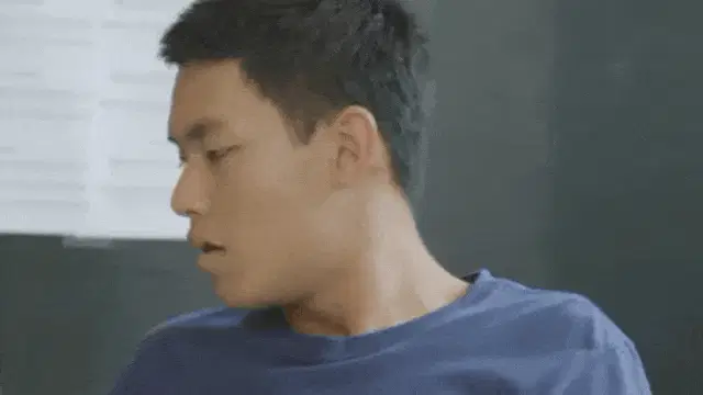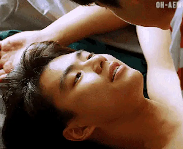 Ohm Pawat's startled Ohmnon reaction while waking up in bed, peeking from under a grey blanket.