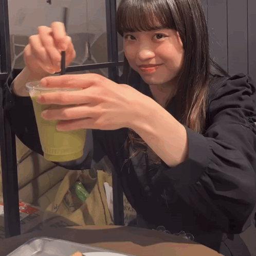a girl in a black shirt is holding a cup of green liquid with a straw