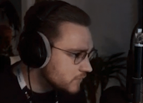 Ohnepixel, wearing headphones and glasses, bites on a lanyard while looking anxious.