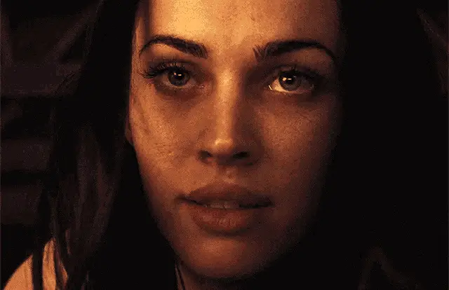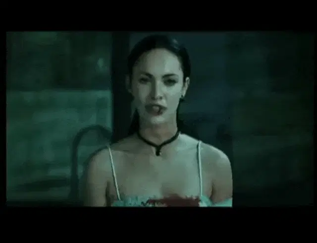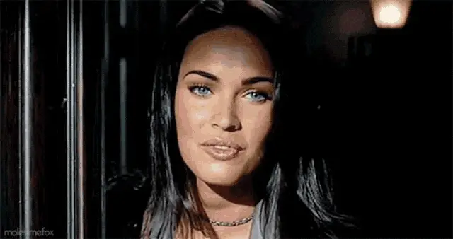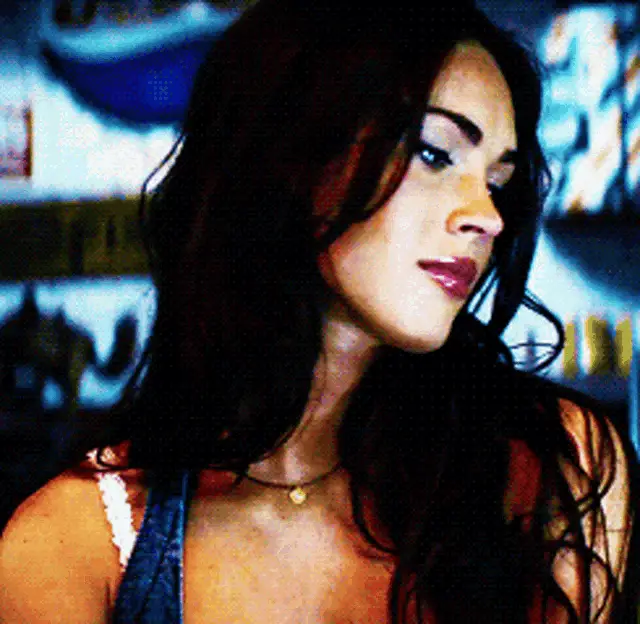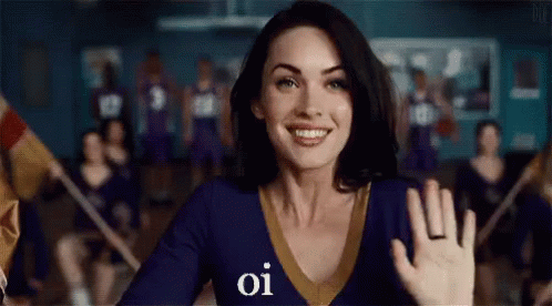 Megan Fox, in a purple and gold cheerleader uniform, smiles and waves at the camera as the word 'oi' appears.