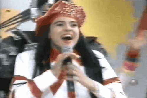 Mara Maravilha performs 'Oi Olágalera' with a microphone, wearing a red beret and white outfit.