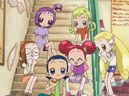 Ojamajo Doremi Dokkaan characters, including Senoo Aiko, Harukaze Doremi, Fujiwara Hazuki, Asuka Momoko, Segawa Onpu, and Hana, making funny faces and reacting comically.