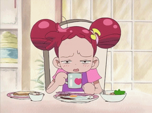 An Ojamajo Doremi character looks groggy at breakfast, yawning and stretching at the table.