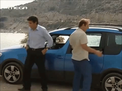 Makis and another man stand by a blue car, with Makis gesturing and talking. A black car is in the background.