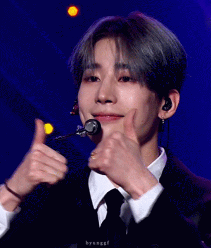 Ok Seungwoo, a member of Victon, performs on stage with a charming smile and stylish grey hair.