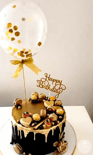 Okaber's elegant black and gold birthday cake with a clear balloon and 'Happy Birthday' topper.