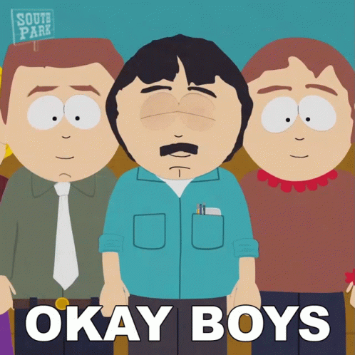 Randy Marsh from South Park says 'Okay Boys' with other characters.