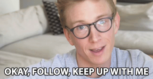 Tyler Oakley speaks directly to the camera with the phrase 'Okay, Follow, Keep Up With Me' displayed.