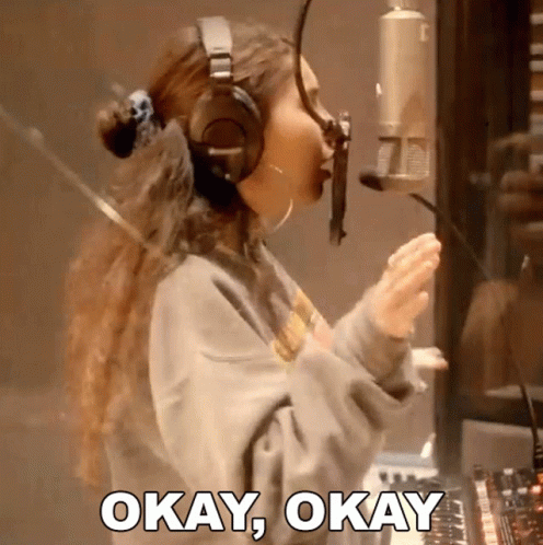 Alessia Cara in the recording studio, wearing headphones and singing into a microphone, with 'Okay Okay' displayed.