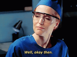Gillian Anderson as Scully, wearing a blue scrub top and safety glasses, delivers a deadpan 'Well, okay then.'
