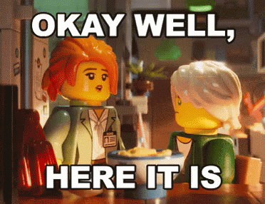 Two Lego Ninjago figures are shown at a table with the caption "Okay Well, Here It Is."