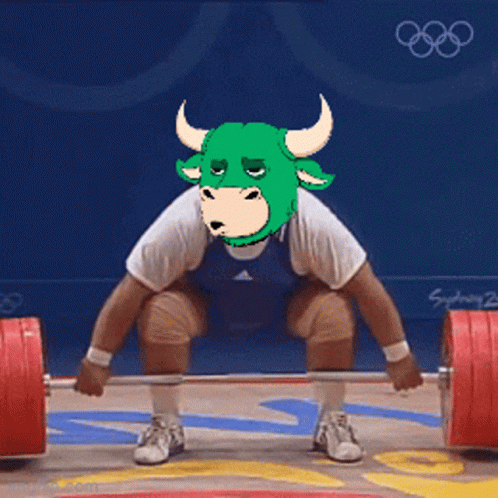 Okaybulls Wagbull character, represented by a green bull's head, successfully performs a heavy weight lift.