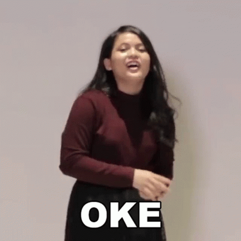 Putri says 'Oke' while wearing a maroon sweater and black skirt against a plain background.