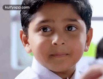 A young boy in a school uniform makes a funny, expressive face with a playful look.