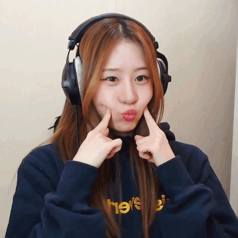 Okheeji makes cute aegyo expressions, pouting and poking her cheeks while wearing headphones.