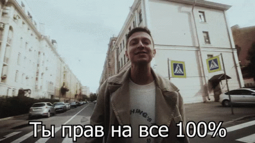 Russian rapper Oxxxymiron on a city street, saying 'Ты прав на все 100%' (You are 100% right).