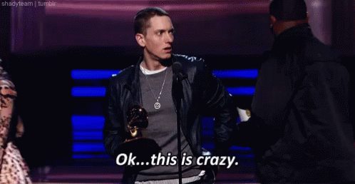 Eminem reacts to winning an award, exclaiming 'Ok...this is crazy' at an awards ceremony.