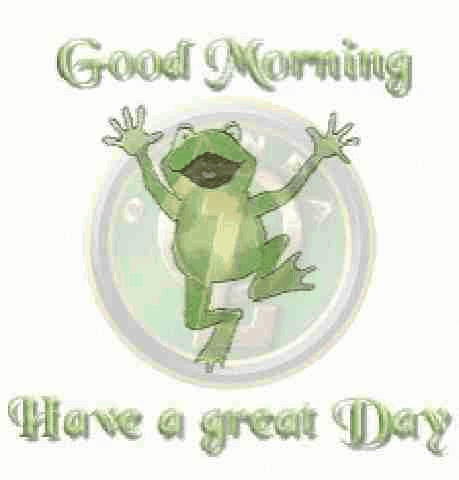 A cheerful green frog jumps with a 'Good Morning, Have a great Day' message.