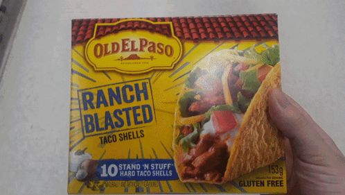 A hand holds a box of Old El Paso Ranch Blasted Taco Shells, featuring a delicious taco image.