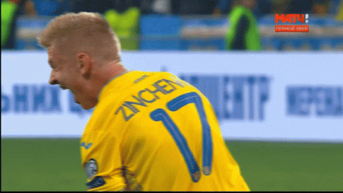 Oleksandr Zinchenko celebrates passionately during Euro2020, wearing his Ukraine national team jersey.