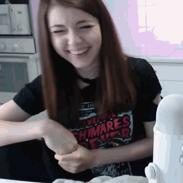 Olyashaasaxon laughing joyfully while sitting on the floor next to a microphone.