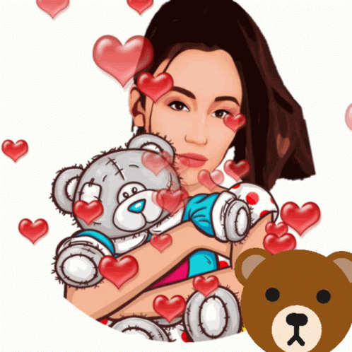 Oliviasui from Smosh holding a plush teddy bear, surrounded by floating red hearts.