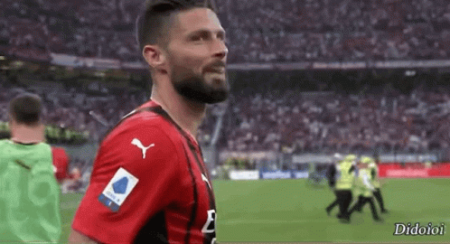 Olivier Giroud, the AC Milan striker, on the football pitch in his red and black jersey.