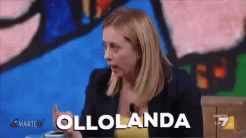 Italian politician Giorgia Meloni animatedly speaking, featuring the viral 'OLLOLANDA' meme.
