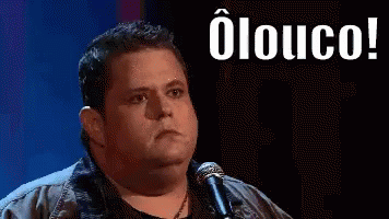 A man reacts with a surprised expression in front of a microphone, with the text "Ôlouco!" displayed.