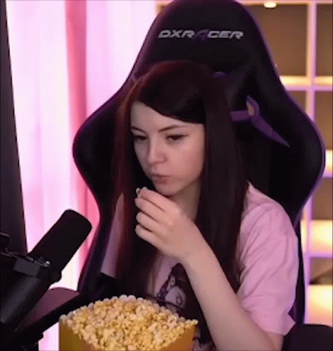 Olyashaa Olyashaasaxon enjoys a large bowl of popcorn while sitting in her DXRacer gaming chair.