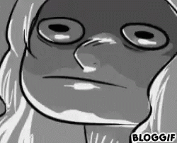 A black and white cartoon of a woman's face intensifying with an exaggerated, rage-like expression.