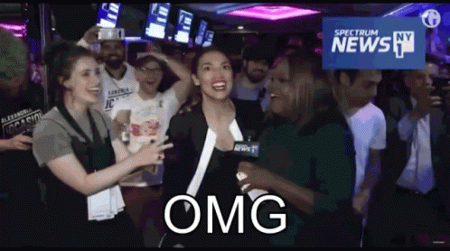 Alexandria Ocasio-Cortez reacts with a shocked 'OMG' during a news interview, surrounded by cheering supporters.