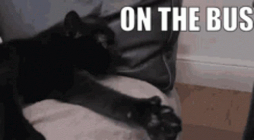 Black cat gives a thumbs up while lying on a couch with 'ON THE BUS' text in the background.