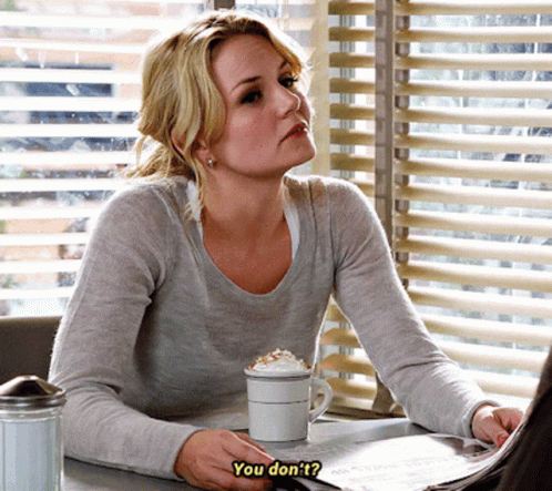 Emma Swan from Once Upon a Time, looking thoughtful at a diner with coffee, asking 'You don't?'