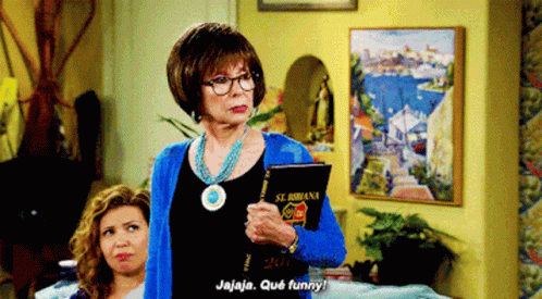Lydia Riera, played by Rita Moreno, reacts with a funny laugh while holding a book in One Day At A Time.