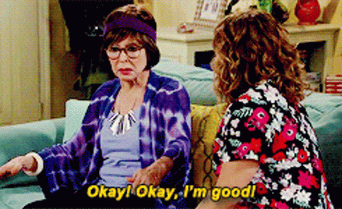 Lydia Riera, played by Rita Moreno, emphatically declares 'Okay! Okay, I'm good!' while sitting on a couch.