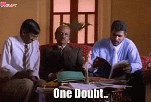 Vadivelu and two men on a couch, with Vadivelu raising a question, saying 'One Doubt..'
