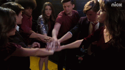 A lively group, the One For All All For One Team, dances energetically in front of a 'Nick' wall.