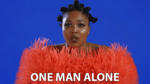 Lizzo in a vibrant red outfit, speaking with 'ONE MAN ALONE' text displayed prominently.