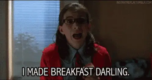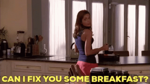 Carrie, played by Torrey DeVitto, from One Tree Hill, stands in a kitchen and asks, 'Can I fix you some breakfast?'