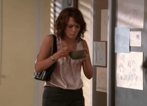 Haley James Scott from One Tree Hill enjoys a bowl of cereal while standing in front of a fridge.