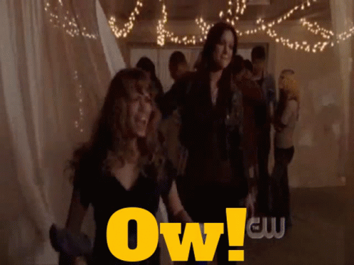 Haley James Scott from One Tree Hill reacts with an 'Ow!' during a dance or social gathering.