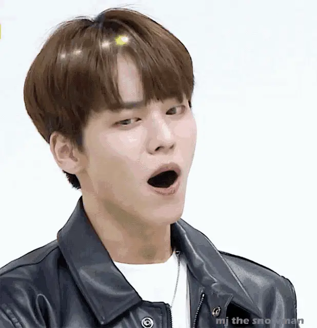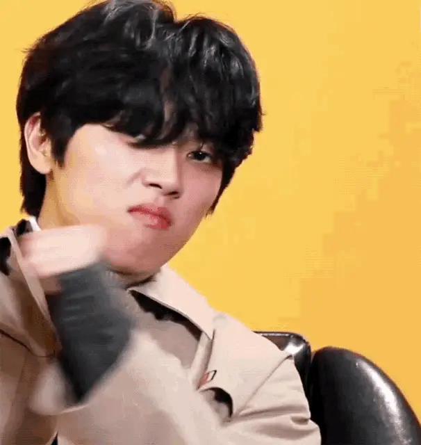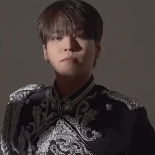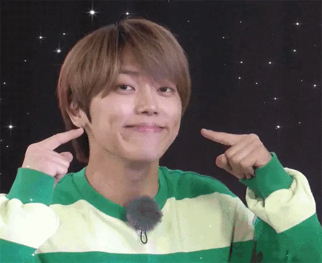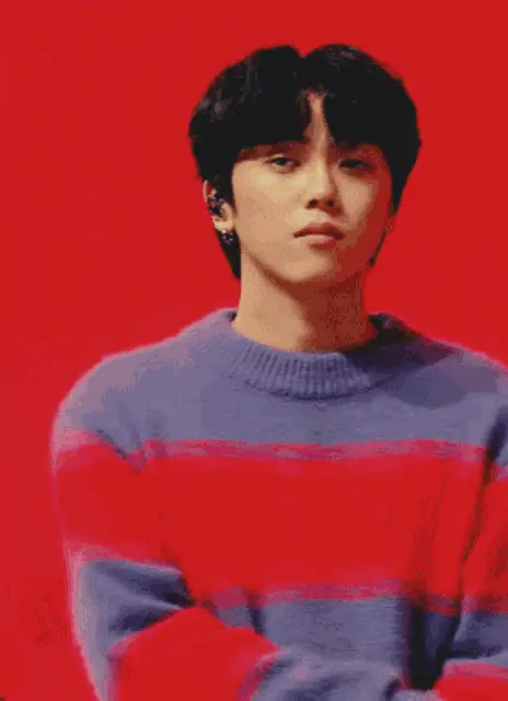 ONF's Hyojin captured in a close-up, biting his lip while wearing a pastel striped sweater.