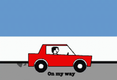 A simple cartoon animation shows a man driving a red car with the text 'On my way' displayed below.