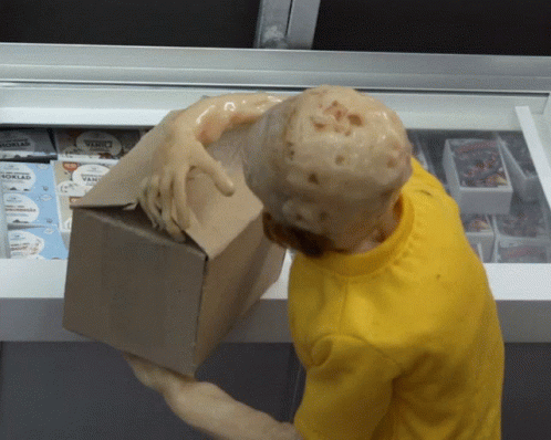 Stop-motion figure in yellow shirt unpacks a cardboard box into a freezer, stocking ice cream.