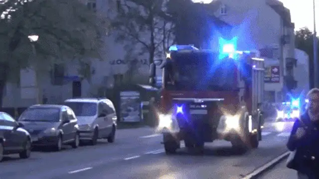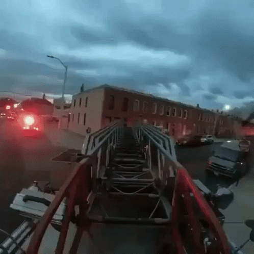 A firetruck speeds through a city street, its ladder extended, heading towards a visible fire under a cloudy sky.