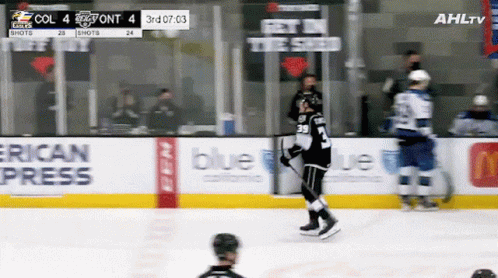 Alex Turcotte of the Ontario Reign celebrates a goal during an AHL hockey game.