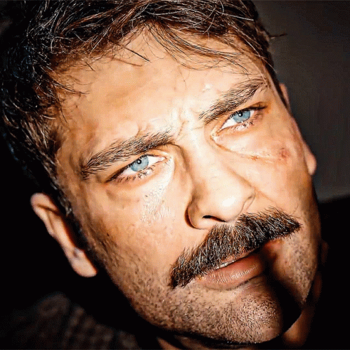Onur Tuna's intense close-up from Mahkum, featuring his striking blue eyes and mustache.
