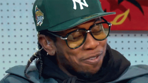 Trinidad James reacts with an amazed expression, wearing a green NY hat and glasses.