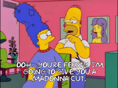Homer Simpson tells Marge she's feisty and offers her a 'Madonna Cut' at the hair salon.